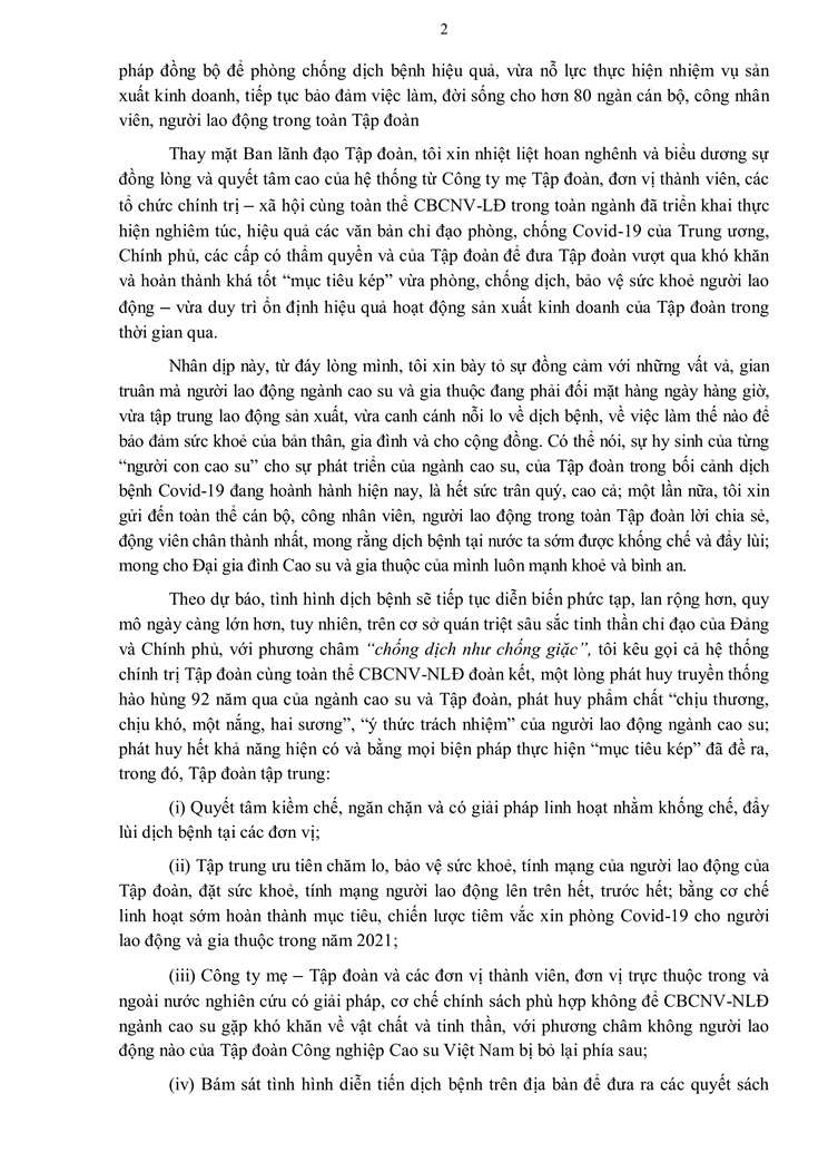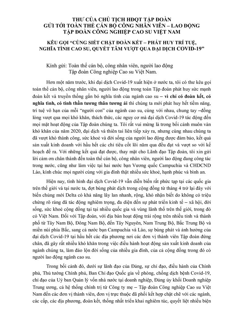 THƯ CỦA CHỦ TỊCH HĐQT TẬP ĐOÀN CNCS VIỆT NAM