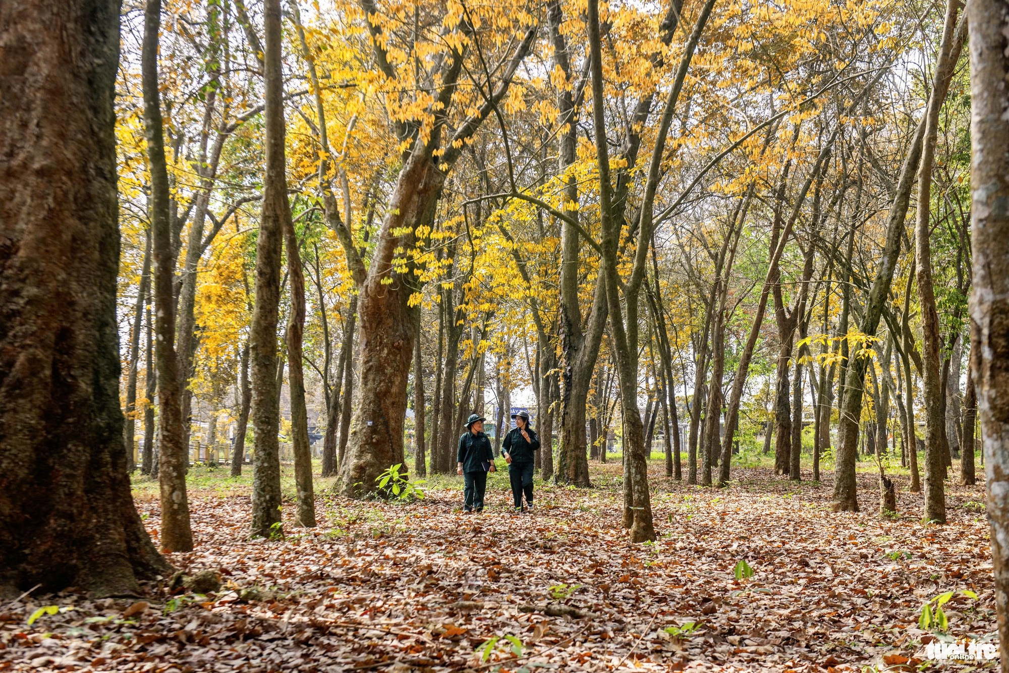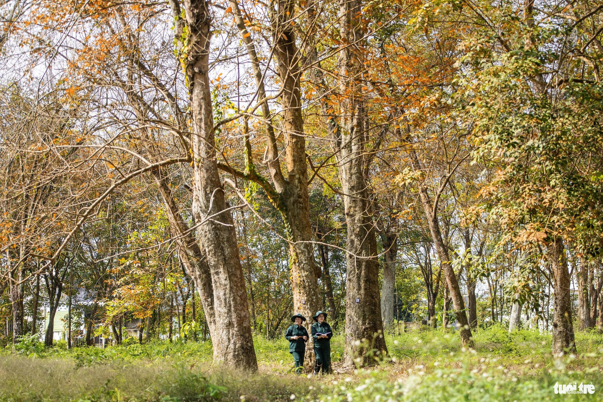 Vườn cao su đang mùa thay lá trở thành nơi tham quan, chụp ảnh của nhiều đoàn du khách - Ảnh: LÒ VĂN HỢP