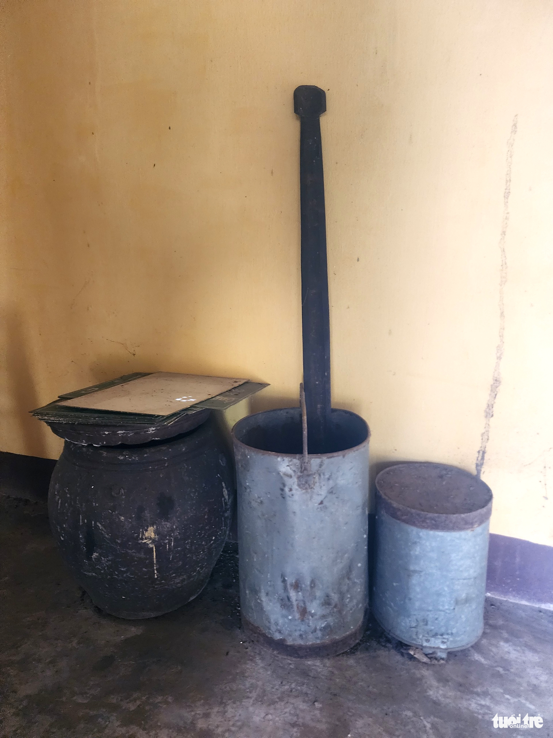 Các thùng 15 lít (nhỏ), thùng 35 lít (lớn) và dụng cụ được người công nhân dùng để đi lấy mủ cao su đang được lưu giữ trong vườn bảo tồn cao su - Ảnh: H.M.